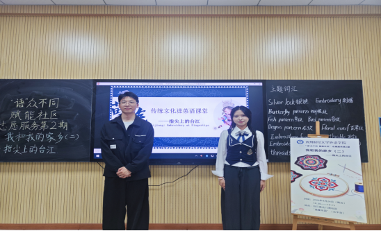 西校区励学楼318教室如期开展。本期以“指尖上的台江——Taijiang: Embroidery at Fingertips”为主题,志愿者李婷婷、张阗、刘汉燊通过云端连线,带领台江县北门湾社区“益童乐园”的小朋友们,从苗族刺绣中学习英语表达,在纹样故事里感知家乡文化。